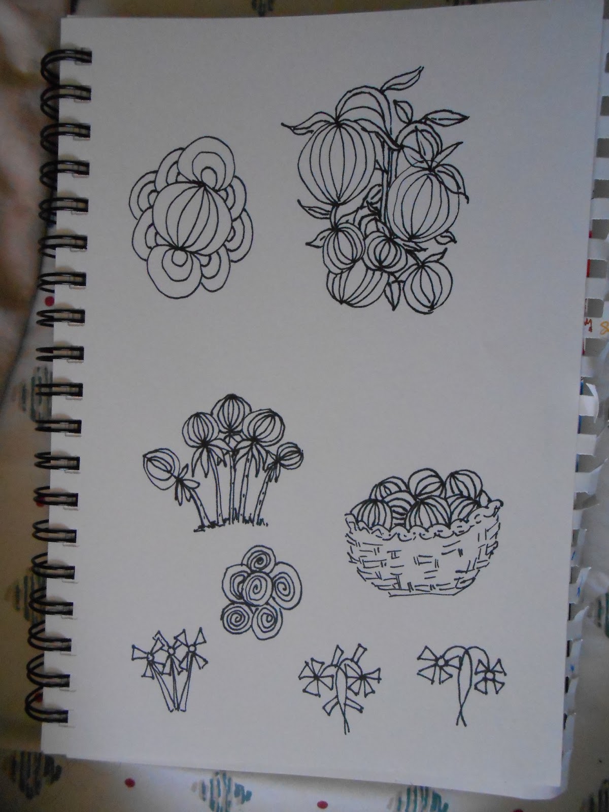 There are places on line where you can order fabric with your homemade print on it.... it's really expensive though! I like the melon looking sketch - that would make a great fabric print!